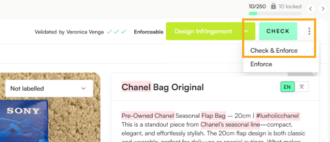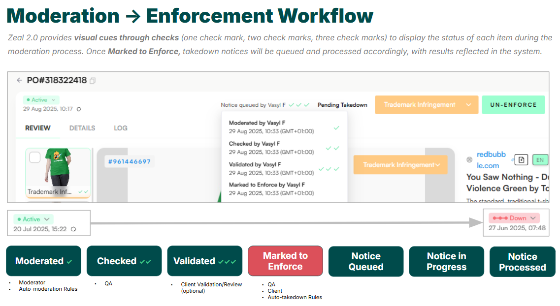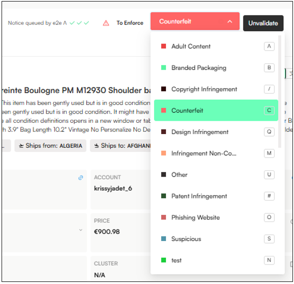 Validate and Enforce - Provides client confirmation that the label of the item is infringing AND is marked for enforcement (takedown)