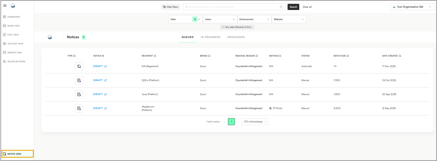 Prepare enforcement notices in the Notice View, with supporting details (IP asset, infringement type, platform/site code).