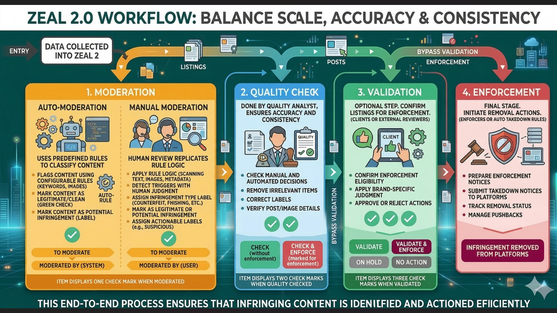 This end-to-end process ensures that infringing content is identified and actioned efficiently.