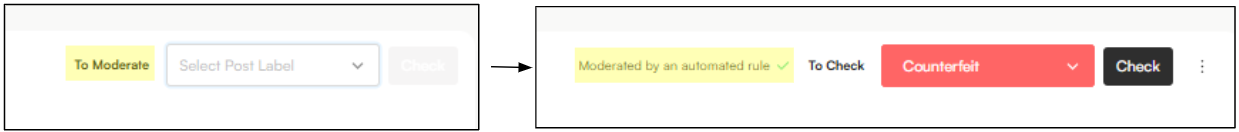 When a label is applied—either by an auto-moderation rule or by a moderator—the workflow status updates from To Moderate to Moderated by, indicating whether the item was handled automatically or by a specific user.