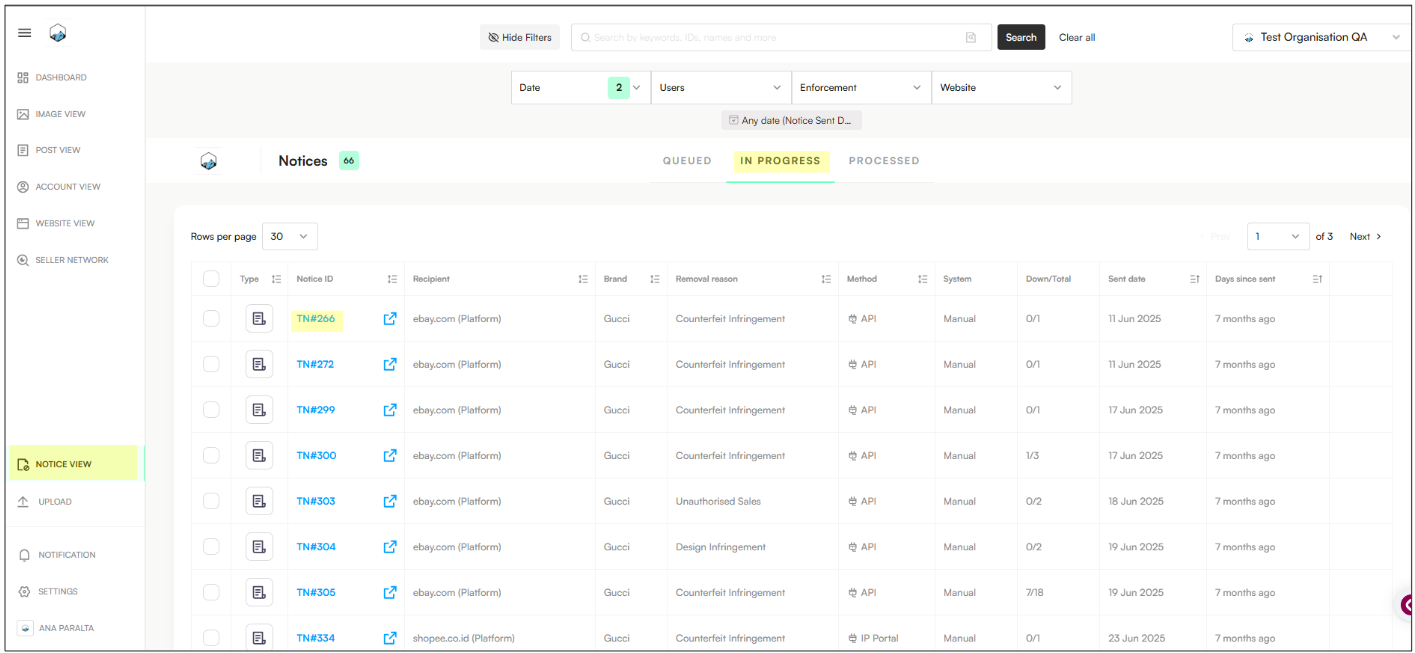After validation, notices appear in the Notice View and the Queue stage. Click Send Now (individual or bulk) to send them to platforms and move them from Queue to In Progress.