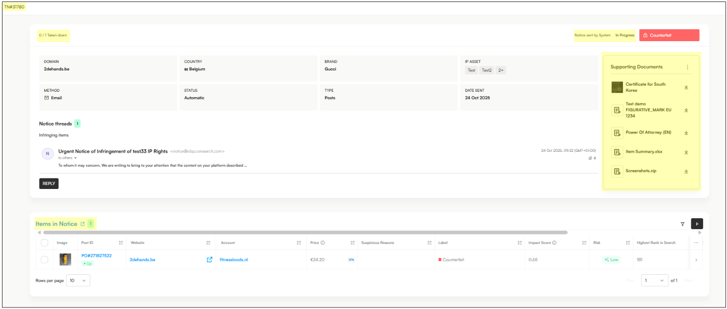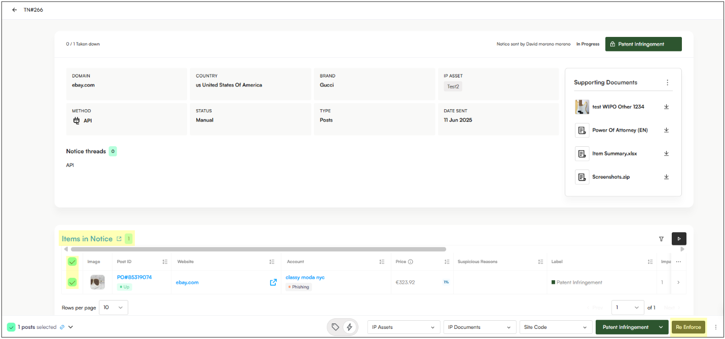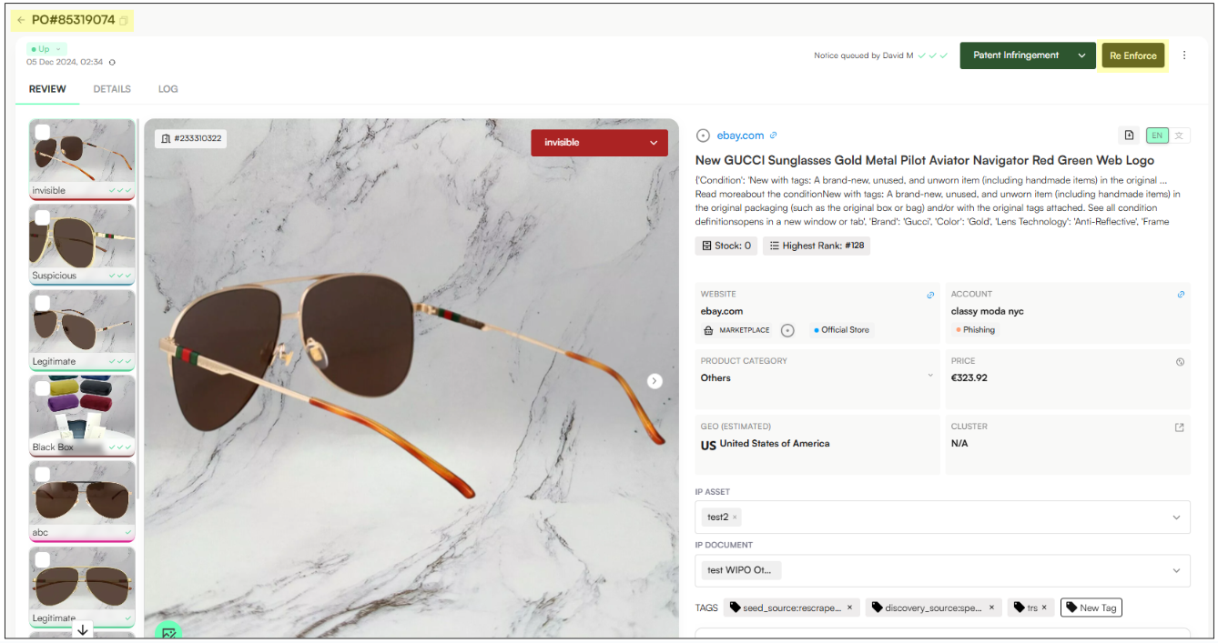Note: All items in notices already contain the TRS (takedown request sent) tag. This tag is automatically applied when listings are sent from the Notice View. When items require to be re-enforced, the system will apply also the RTRS tag.