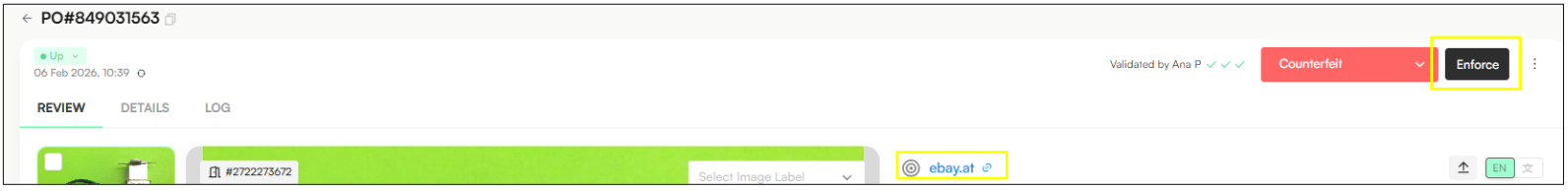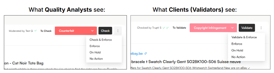 Enforce | Client (Validator) / Brand Partner | Directly authorizes the item for enforcement (item has already been reviewed/validated prior, or validation has been skipped). |