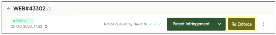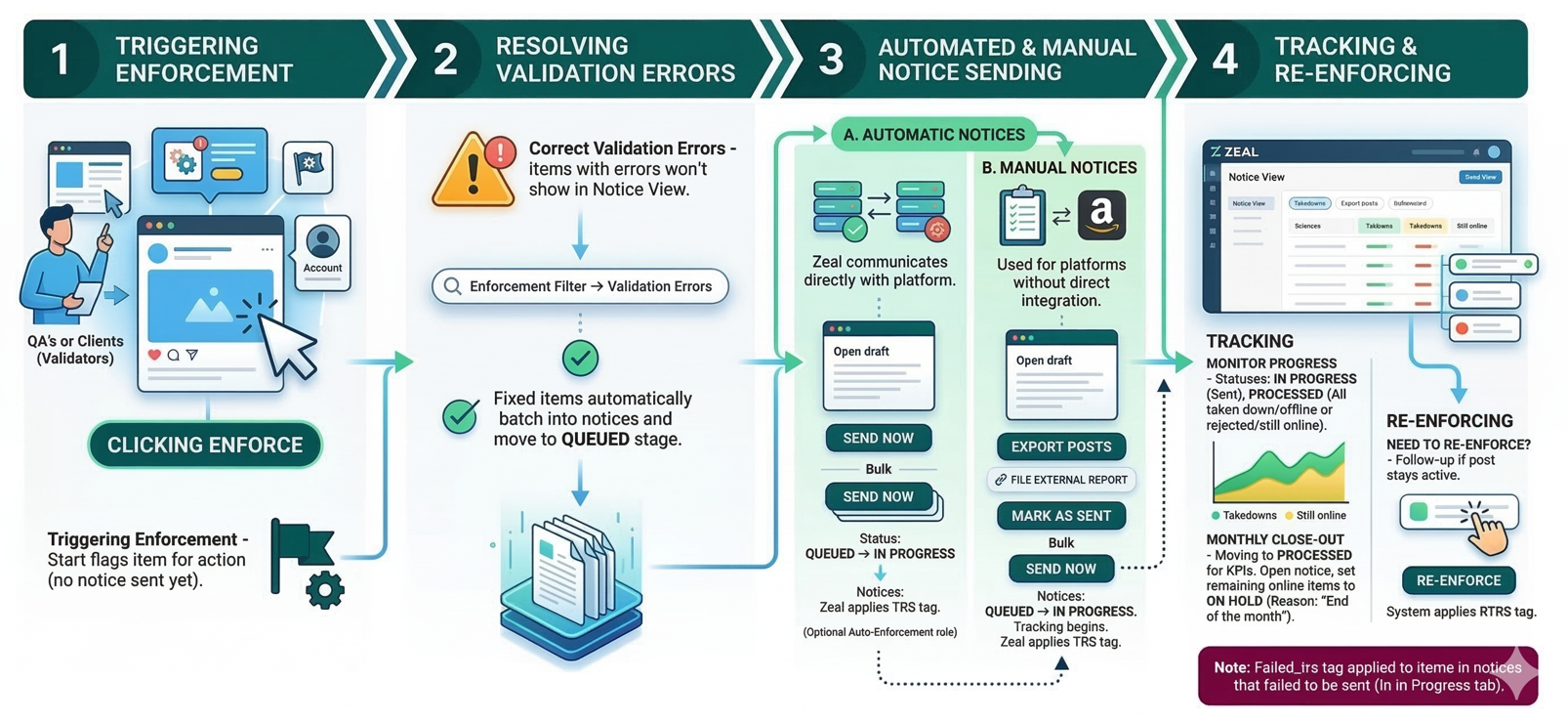 Enforcement begins when someone clicks “Enforce” on a post, website or account. This action marks items for enforcement - It does not send an enforcement notice yet!