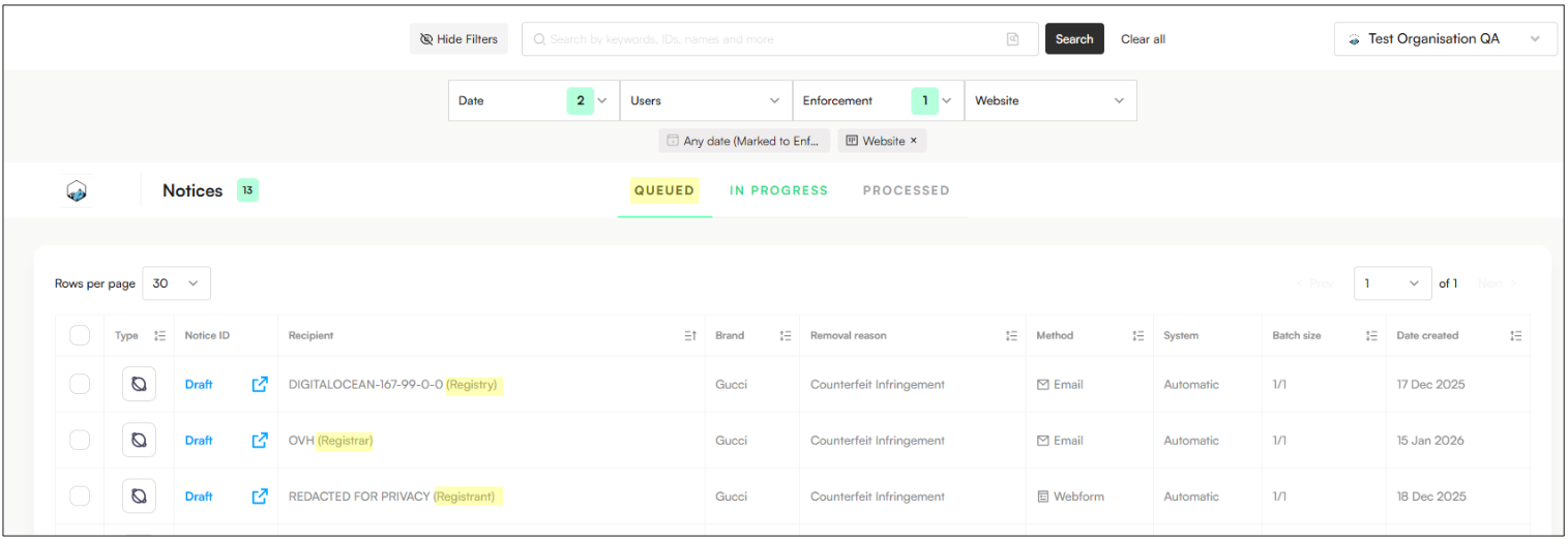 Click Enforce. The domain appears in Notice View as a draft (if no validation errors). The notice is not sent yet; it stays in the Queue until sent automatically by rules or manually via Send Now.