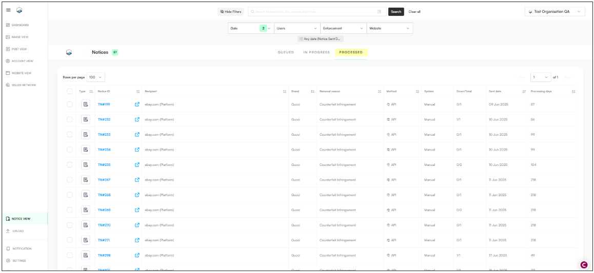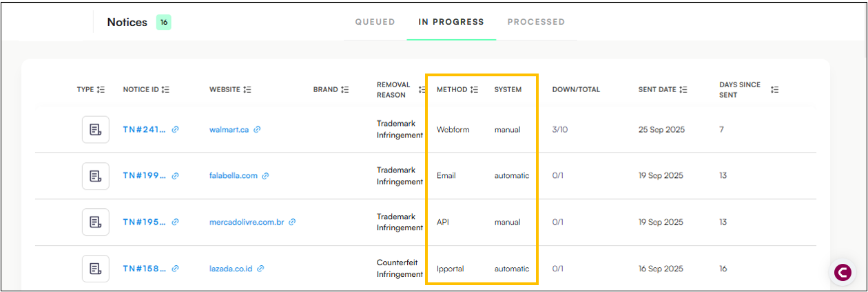 Method – Indicates the auto-enforcement method used to issue the notice. Possible methods include Email, API, IP Portal, or Webform, depending on the platform’s integration.