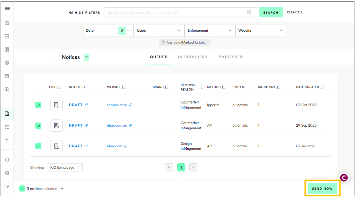 Clicking Send Now will send the notices to the platforms and trigger the notices to move from Queue into In Progress.