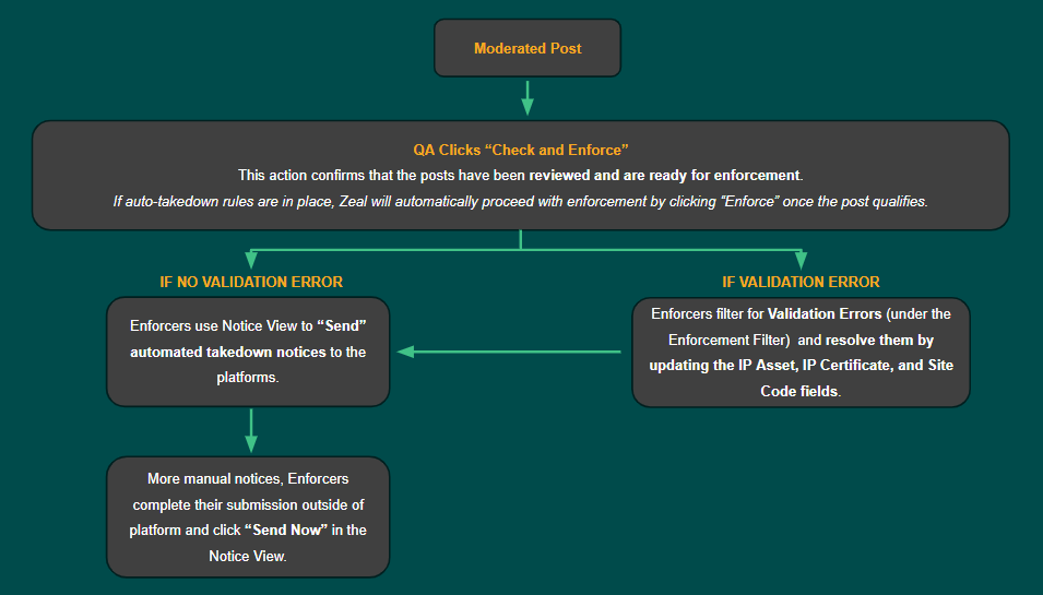 Zeal’s enforcement workflow is designed to guide each post in a structured and transparent way. Below is a step-by-step overview of how enforcement actions are executed in Zeal 2.0.