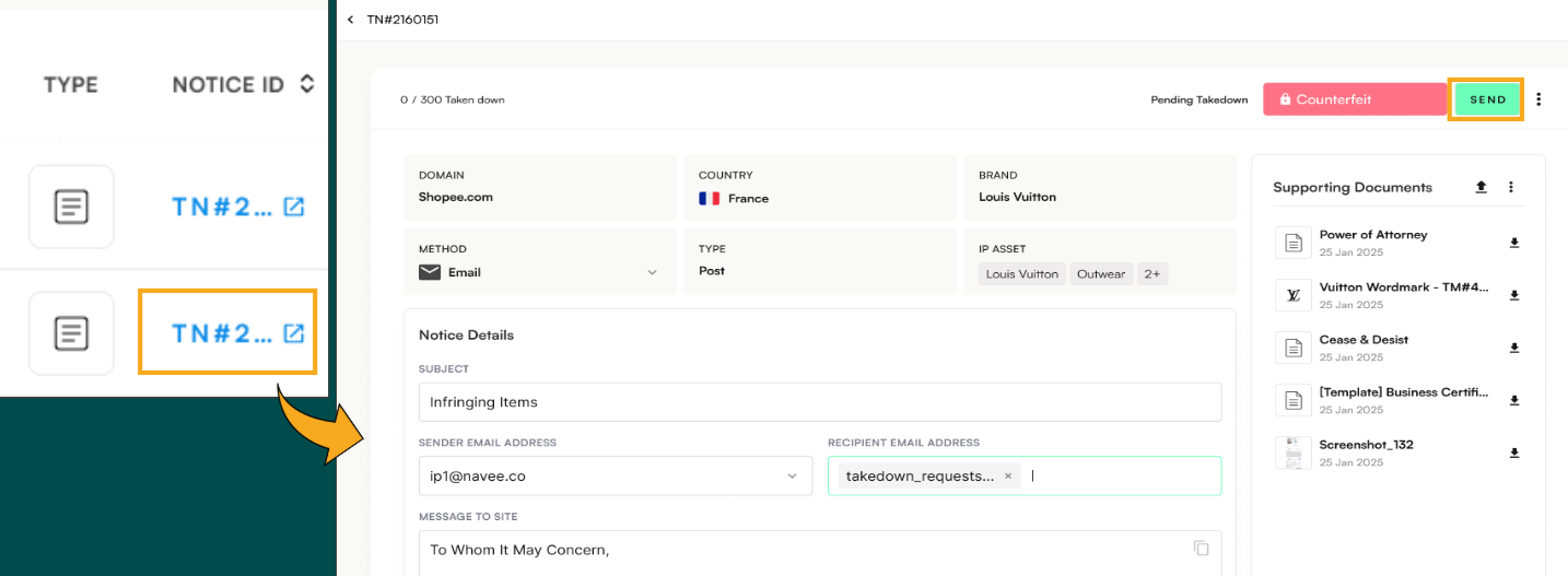 Send Now – Sends the notice directly to the relevant marketplace, platform, or website.