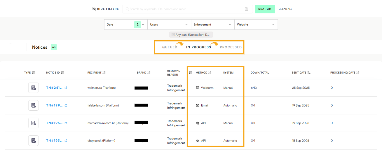 Send Now – Also used to log and track manual takedown actions that were carried out outside the platform.