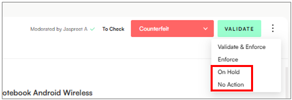 The On Hold and No Action buttons are available after moderation for all items — except those already Enforced.