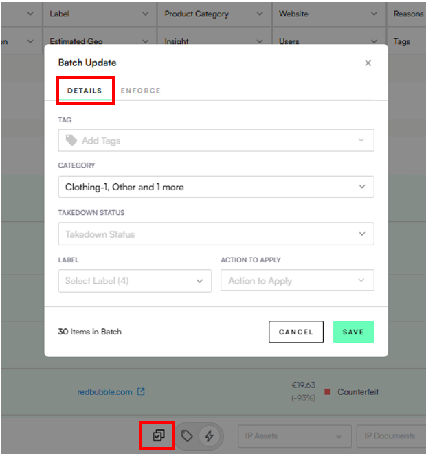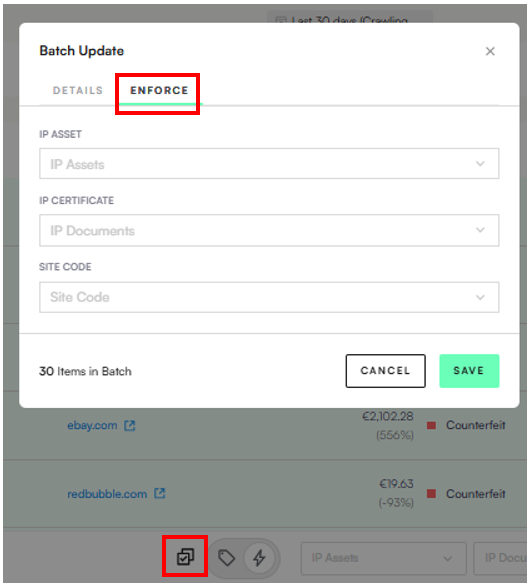 Tag • Takedown Status • Category • IP Asset • IP Certificate • Site Code • Label • Brand • Actions (Check, Validate, Enforce, On Hold, No Action) → Divided into two separate tabs: Details & Enforce.