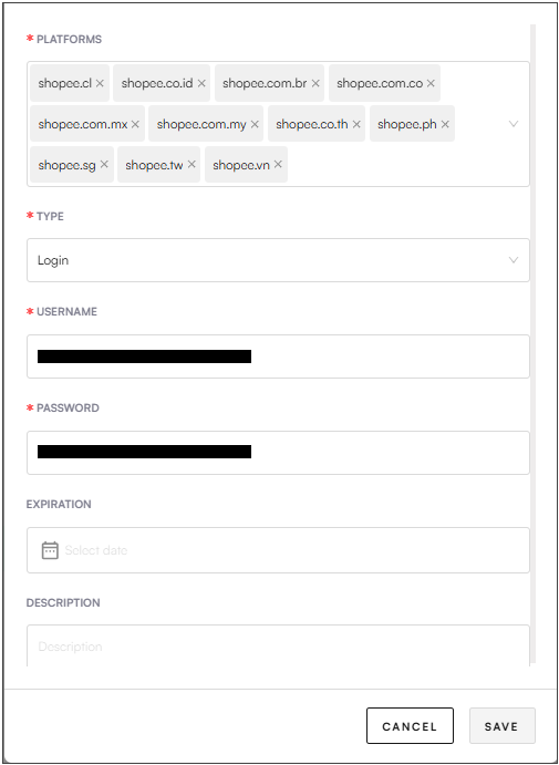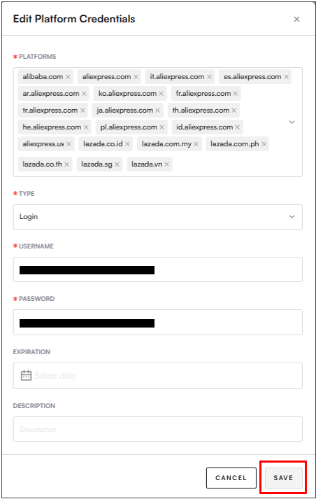Add your Alibaba/AliExpress/Lazada/Miravia portal login credentials in the username and password fields