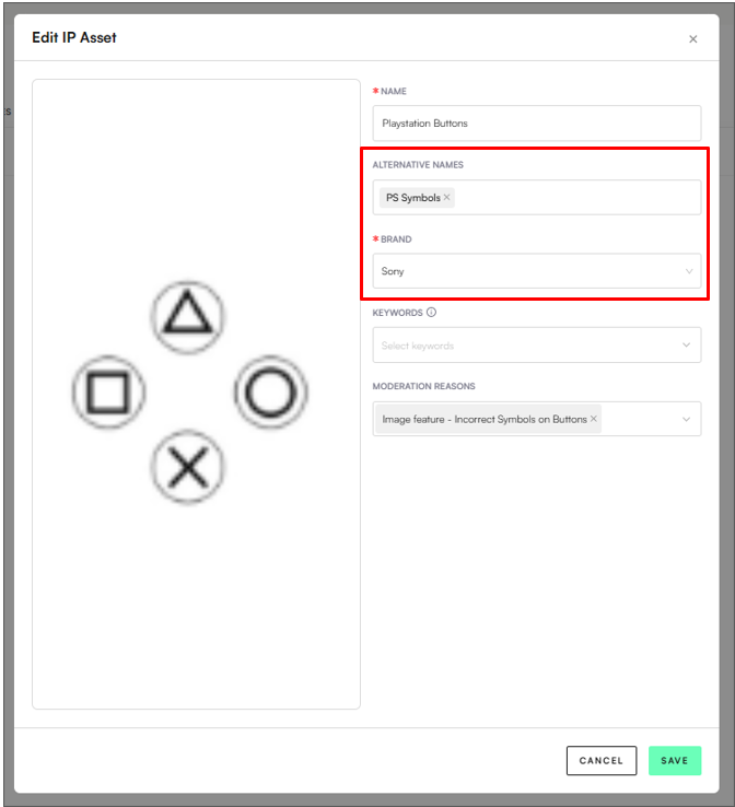 In the example below, the IP Asset “PlayStation Buttons” is linked to the brand Sony. However, since the Shopee IP Portal lists this asset under the brand “PS Symbols”, the Alternative Name field has been updated to “PS Symbols”.