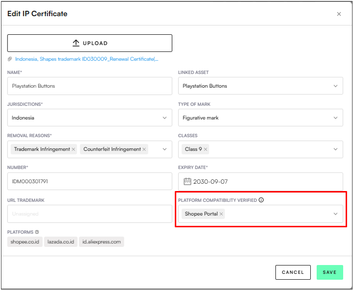 Note: The Region, Brand, Type of IP, and IP Registration Number must exactly match the data in Shopee IPP, with all values being case-sensitive (e.g., Sony ≠ SONY). You will need to populate the Alternate Brand (IP Assets) and the Platform Compatibility Verified (IP Certificates) fields for all assets and certificates that will be used for Shopee enforcement.