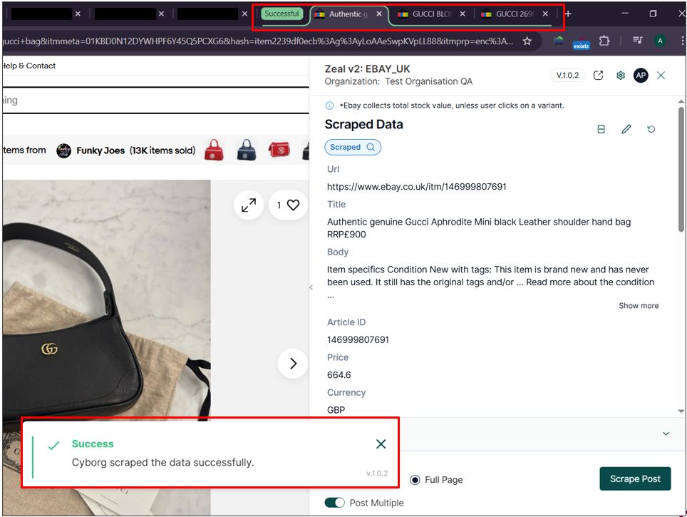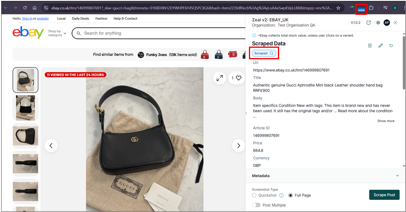 If a listing has already been scraped, it will show Scraped in the side panel (and will also display “exists” in the Cyborg extension icon):