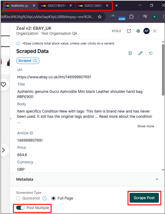 Users can also open multiple listings into separate tabs to be scraped in sequence. To do this, make sure to toggle Post Multiple: ON and click Scrape Post: