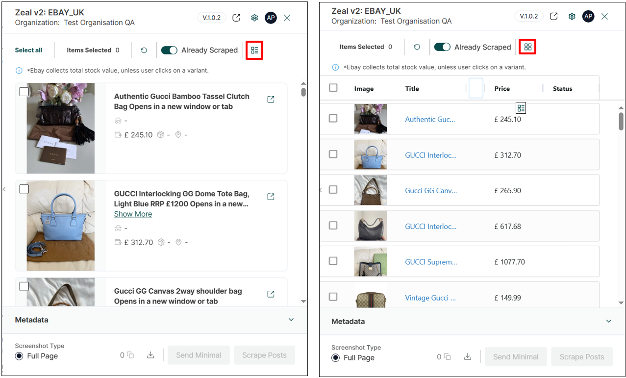In the Cyborg side panel, you can select multiple listings at once using the checkboxes beside each item. If a listing has already been scraped, it will display a “Scraped” badge: