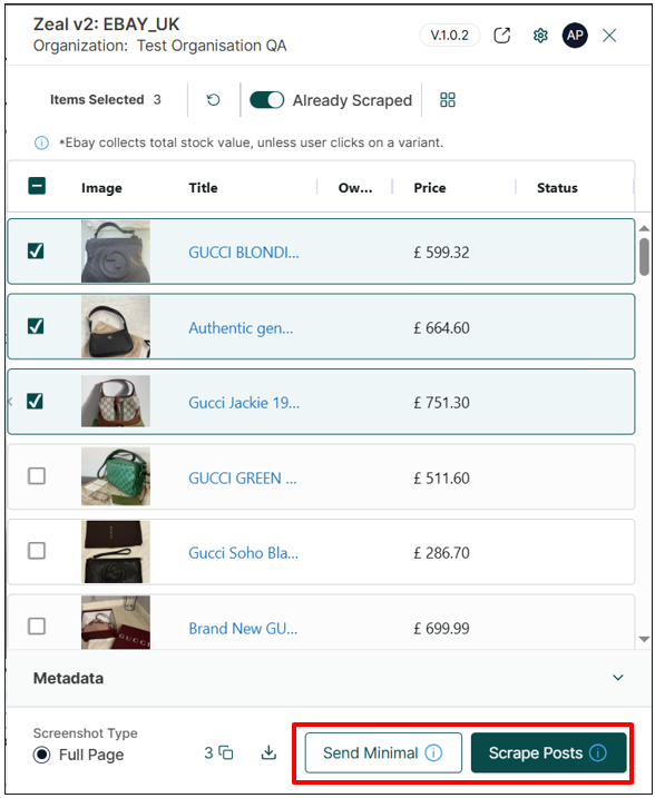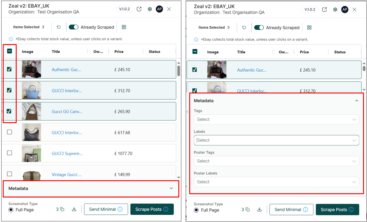Note: In the Metadata tab, you can assign tags and labels to the selected posts. When the listings are scraped into Zeal, they will automatically include the tags and labels you applied.