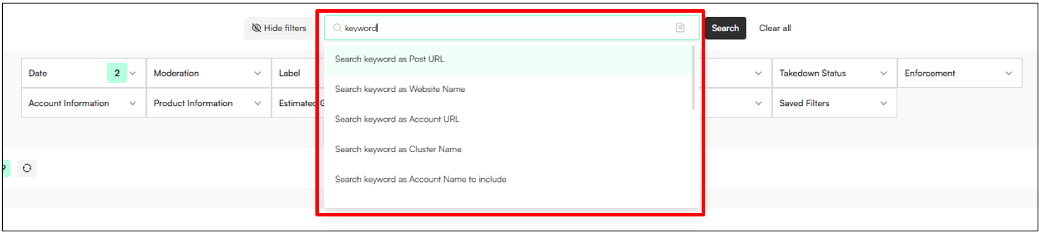 Search keyword as Account URL - Searches for keywords contained in the URL of a user account (e.g., profile links or shop URLs). Useful for spotting specific sellers, storefronts, or repeat infringers.