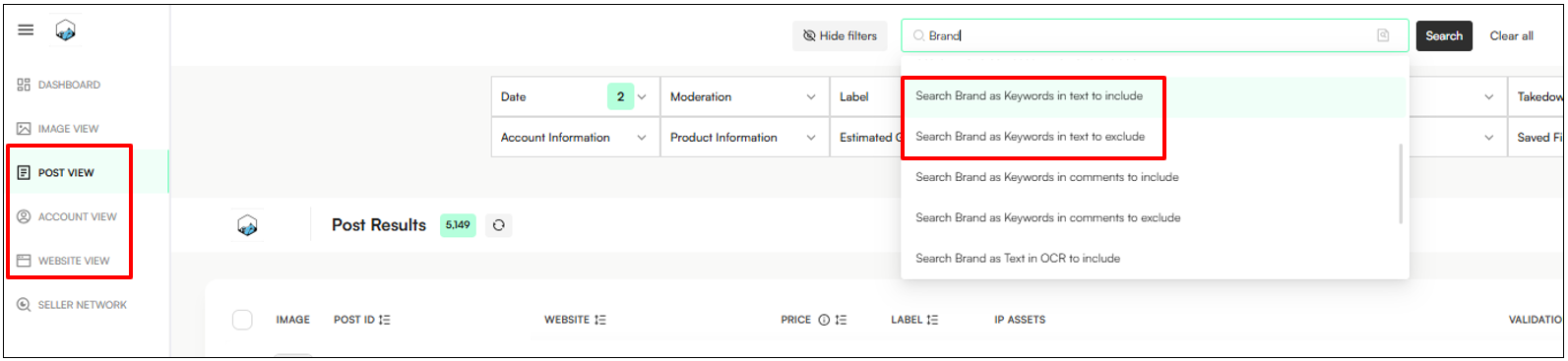 The Keywords in Text to Include / Exclude function allows you to filter listings, accounts, and websites based on specific words or phrases found in their text fields.