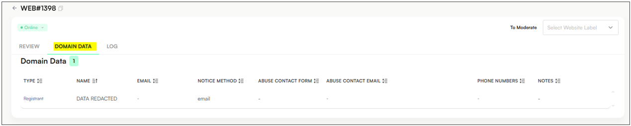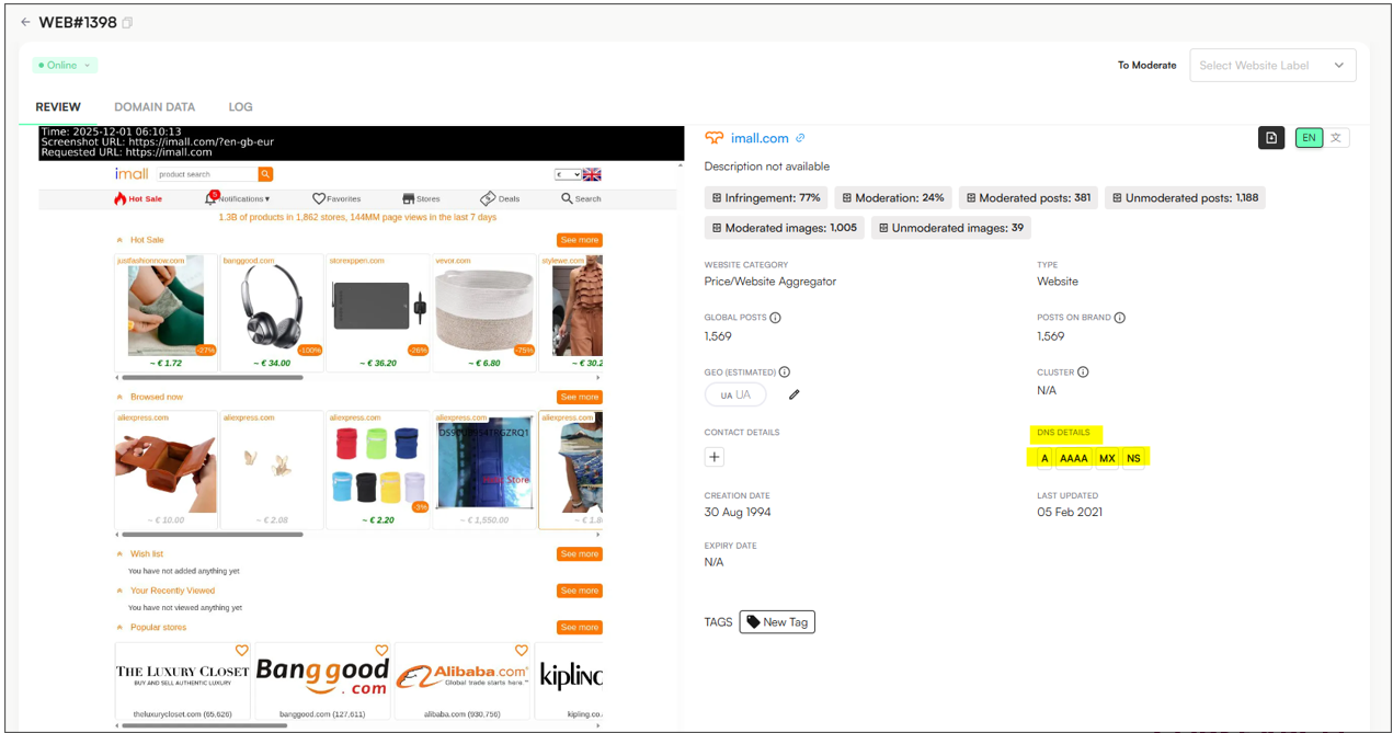 Updated Website Moderation page with cleaner layout and DNS/RDAP info.