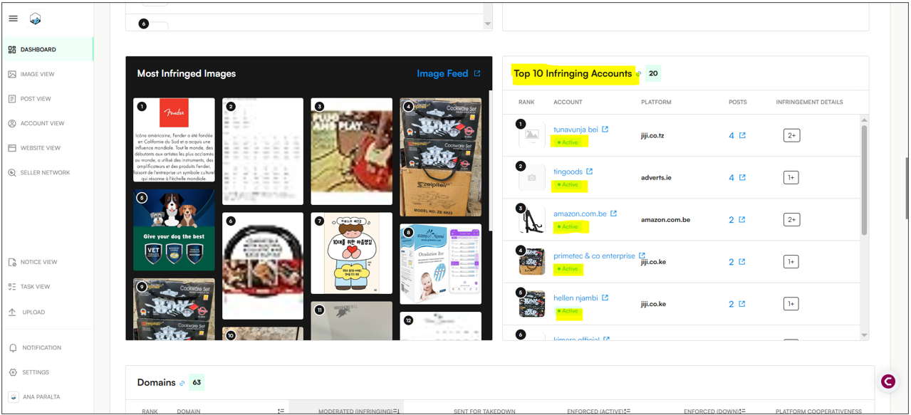 The Top 10 Infringing Accounts dashboard tile now shows Active/Down status.
