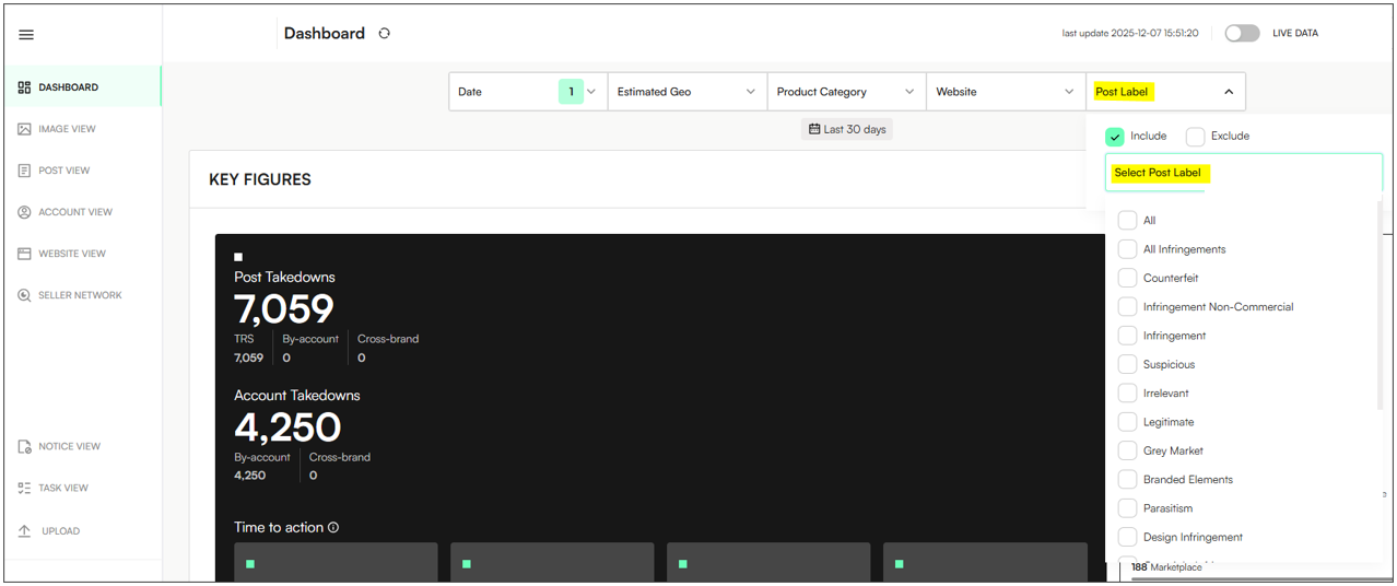 Allows users to refine dashboard insights based on specific labels applied to posts.