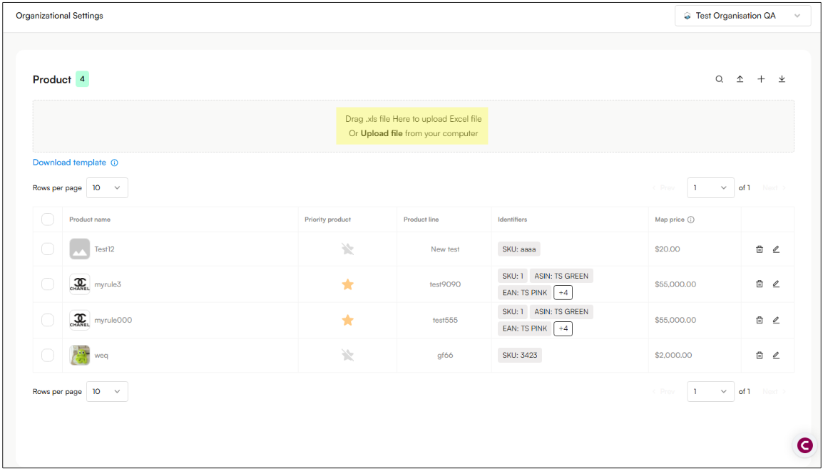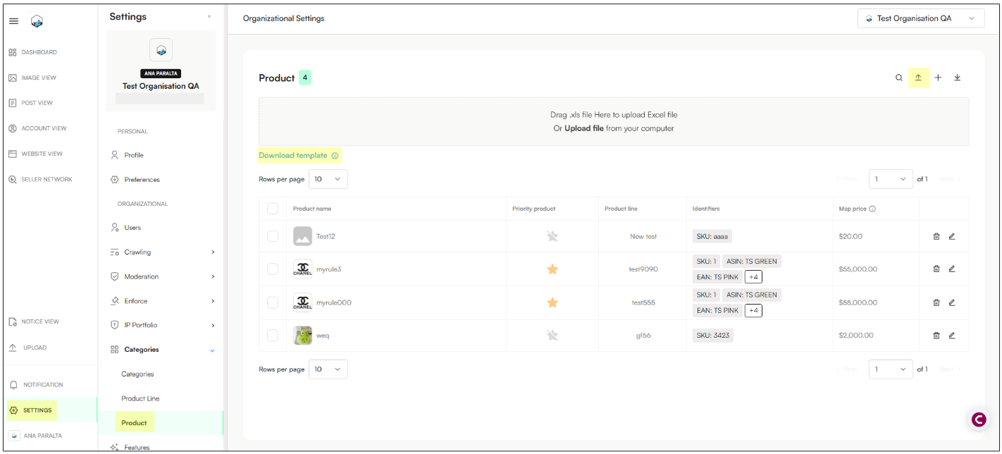 After uploading the file, all products included in the Excel sheet will be displayed on the screen.