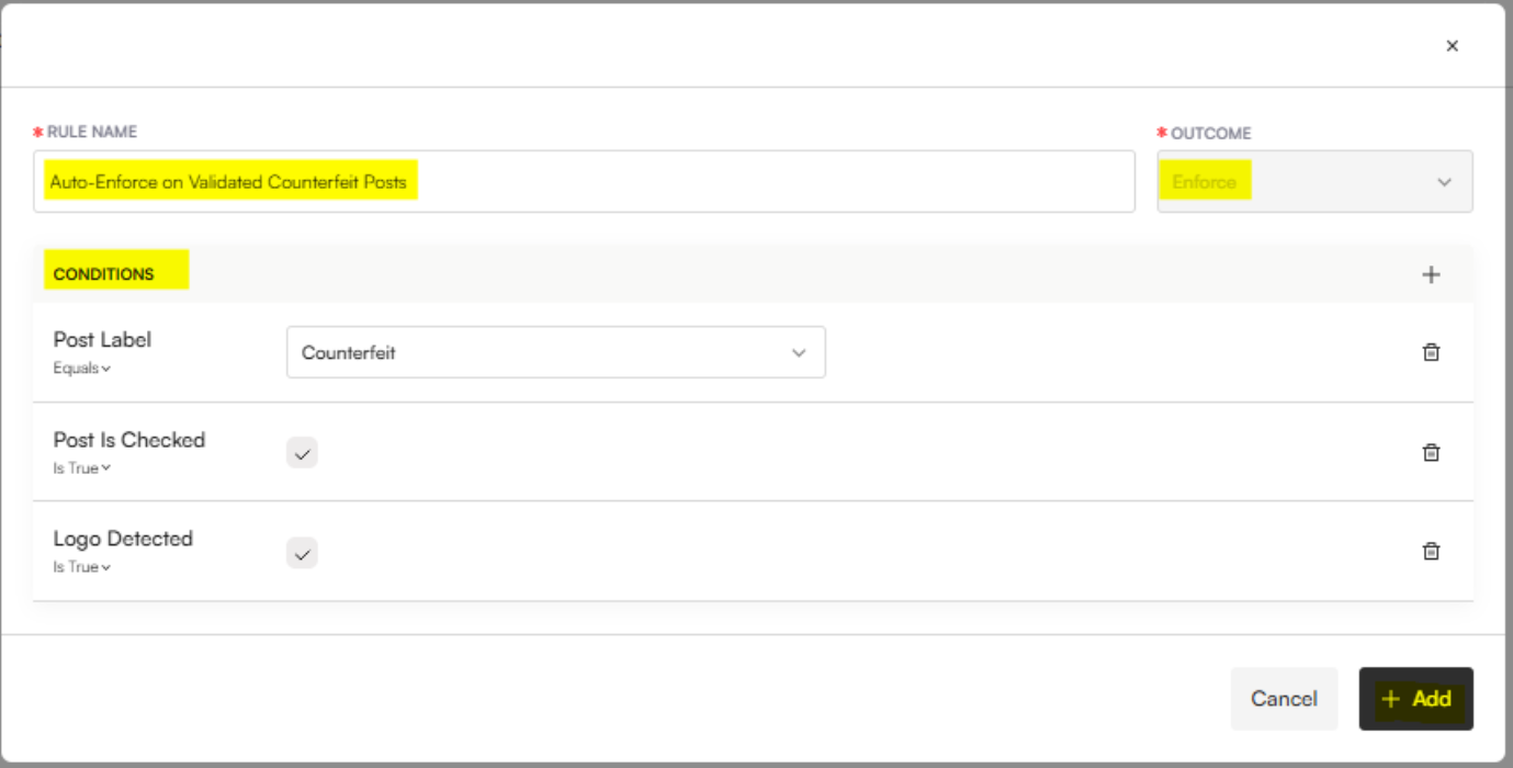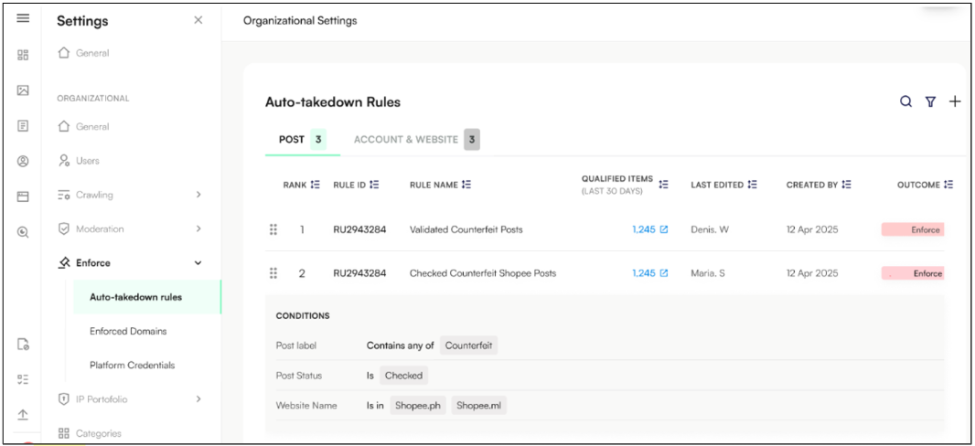 You can now configure auto-takedown rules to automatically send content for enforcement when specific criteria are met. These rules apply to posts, accounts, and websites and are designed to speed up takedown workflows and reduce manual effort.