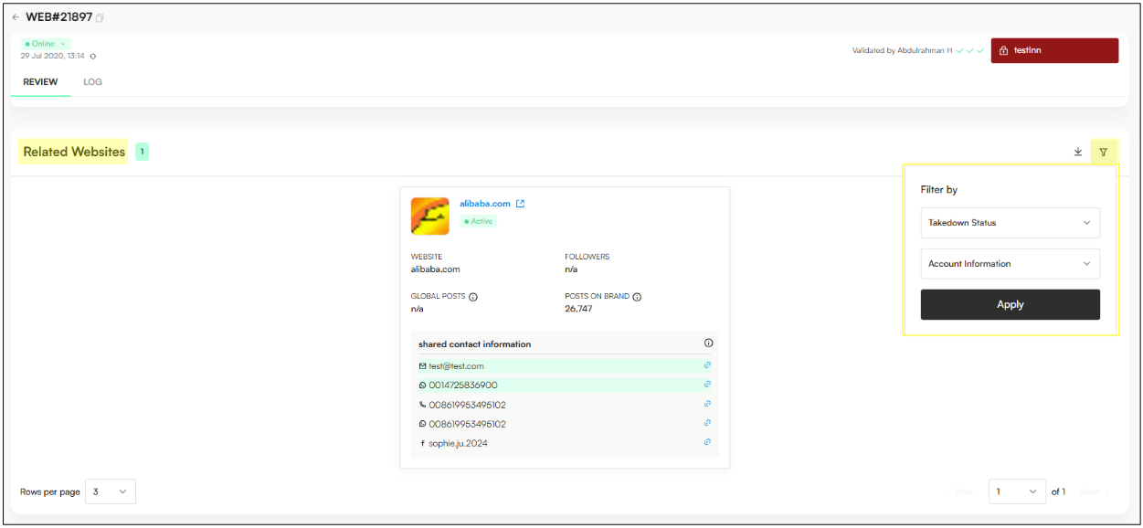 Website View → Related Websites → Filter by Takedown Status and Account Information