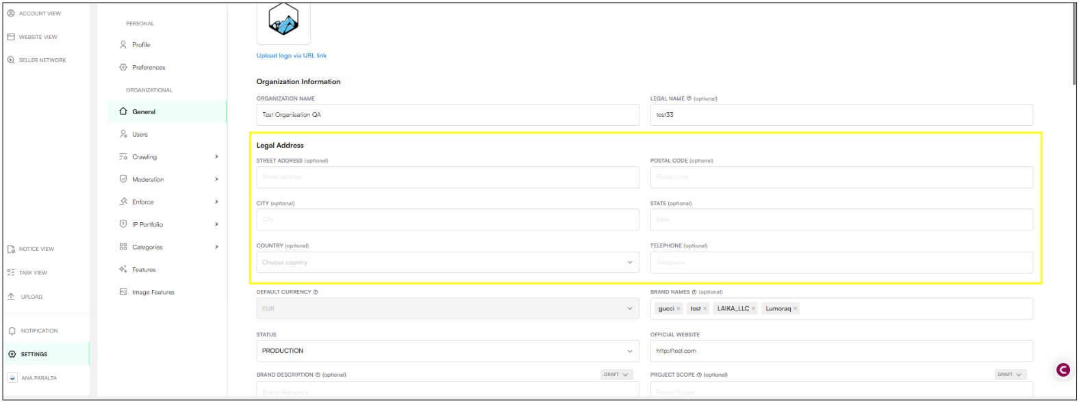 Legal Address Added to Organization Settings → Organizations can now store a dedicated Legal Address — enabling upcoming Google delisting automation. A validation check applies only when submitting Google delisting requests.