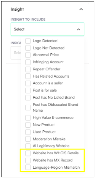 New Insight Filters → Website has WHOIs details / Website has MX Record / Language-Region Mismatch