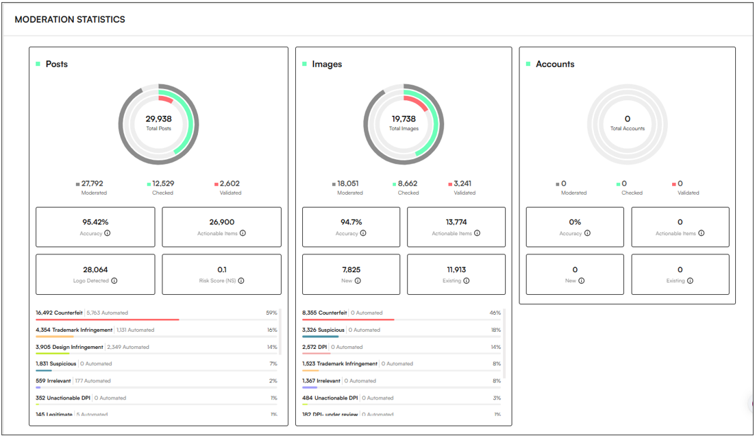 In the Moderation Statistics section of the Dashboard, users can access a detailed breakdown of the following information across posts, images and accounts/sellers: