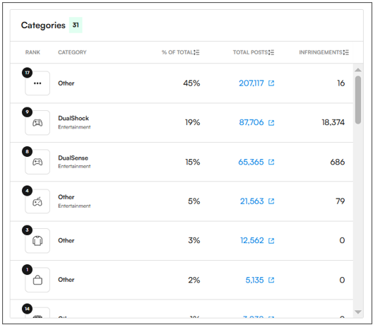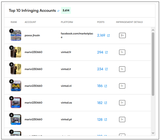 Top Infringing Accounts/Sellers – Sellers or accounts responsible for the most infringing posts.