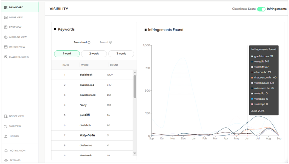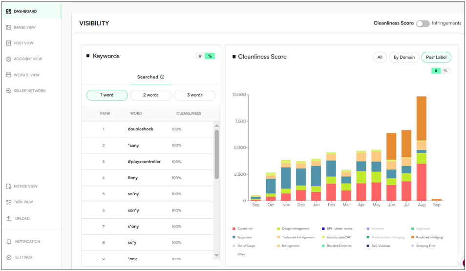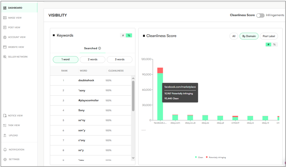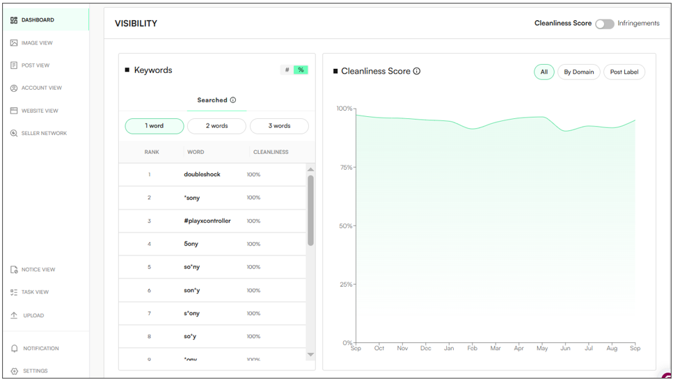 Cleanliness Score Toggle: ON – Users can also assess how free specific platforms or domains are from infringements, using keyword-based metrics.