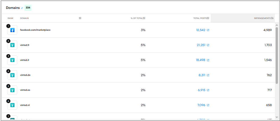 Top Infringing Domains/Sites – Displays the websites, marketplaces or platforms hosting the most infringing content.