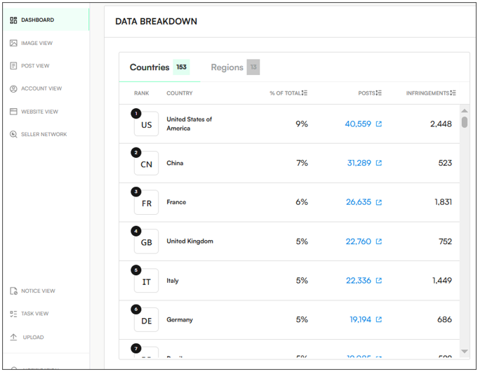 Data Breakdown: Identify the top infringing accounts, regions, products, images, and sites.