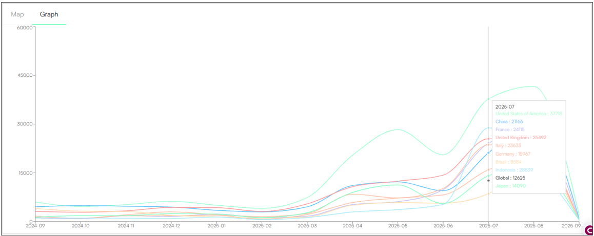 Map – Provides a visual representation of the online infringement landscape, using a colour gradient from green (low infringement) to red (high infringement) to highlight affected regions.