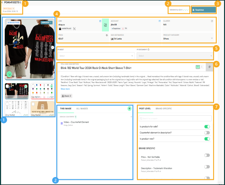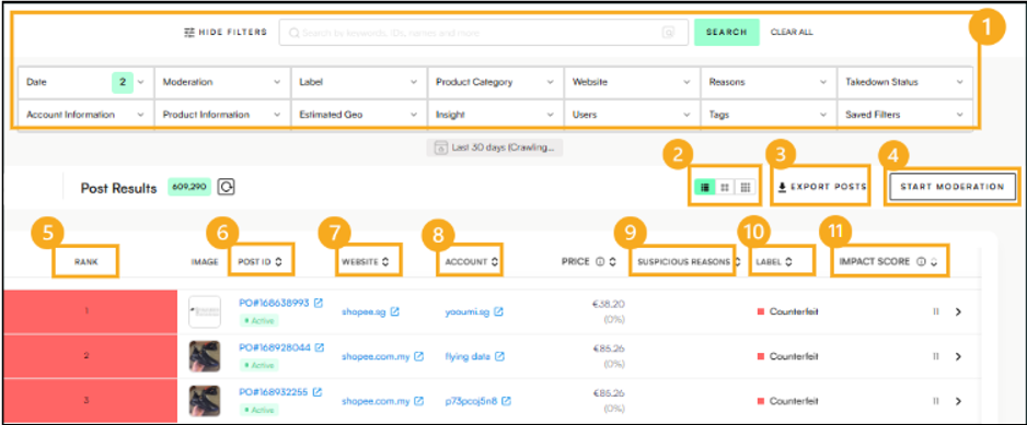 Suspicious Reasons – Filter posts that were flagged for specific behaviours or patterns that may indicate potential infringement or abuse (i.e Logo Detected or Suspicious Seller).