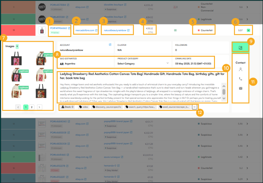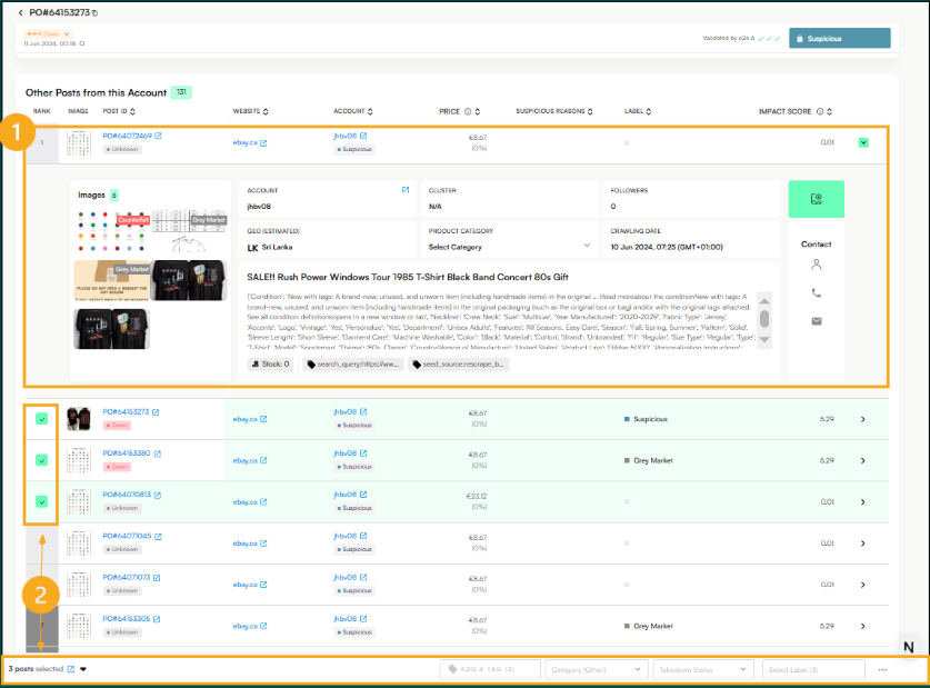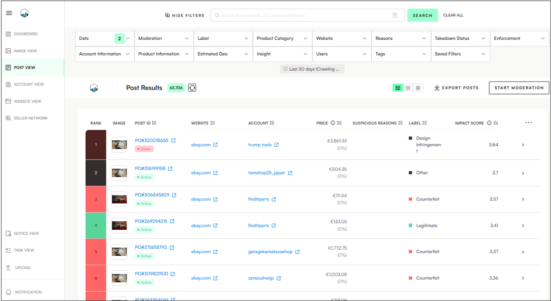 The Post View provides a detailed overview of all detected posts from either a single seller or multiple accounts/sellers. It displays critical data for analysis and enforcement, including: