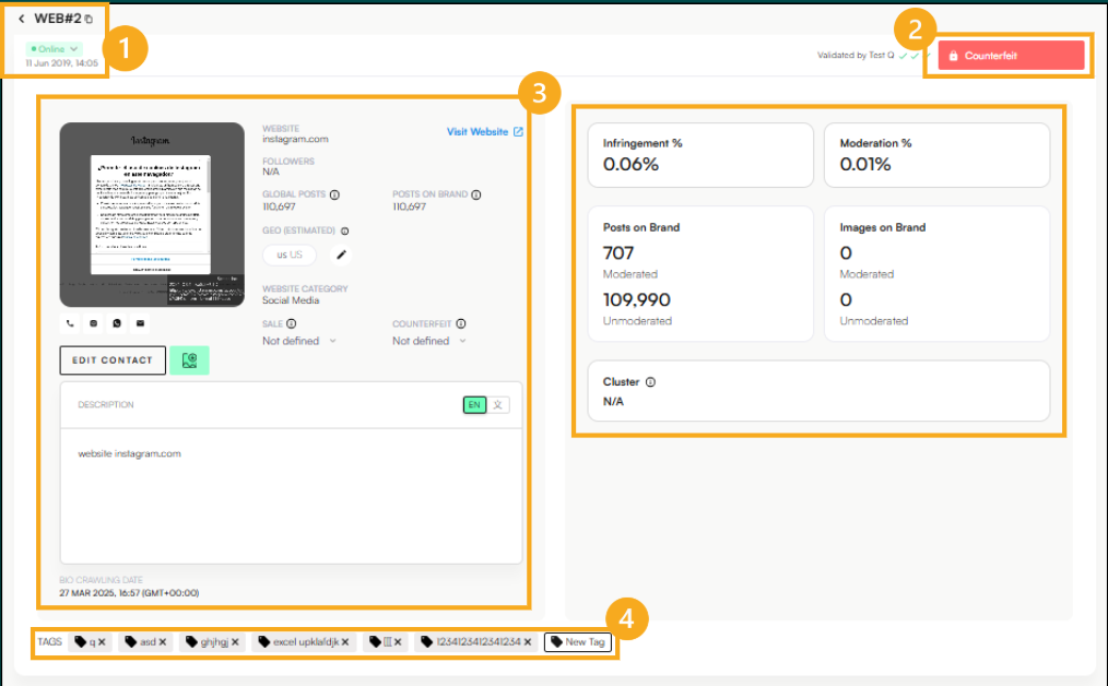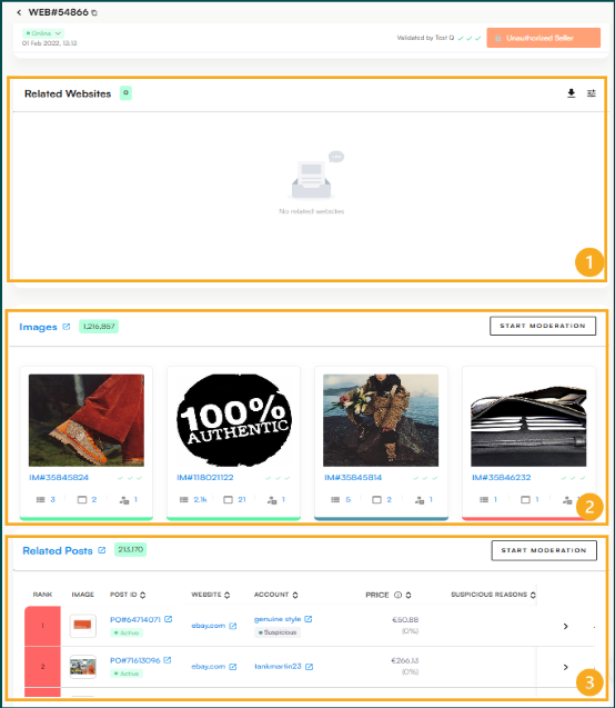 Clicking on a Website opens the individual website view, where users can view detailed information about the website, its images, related websites and infringing posts. The website presents the following information: