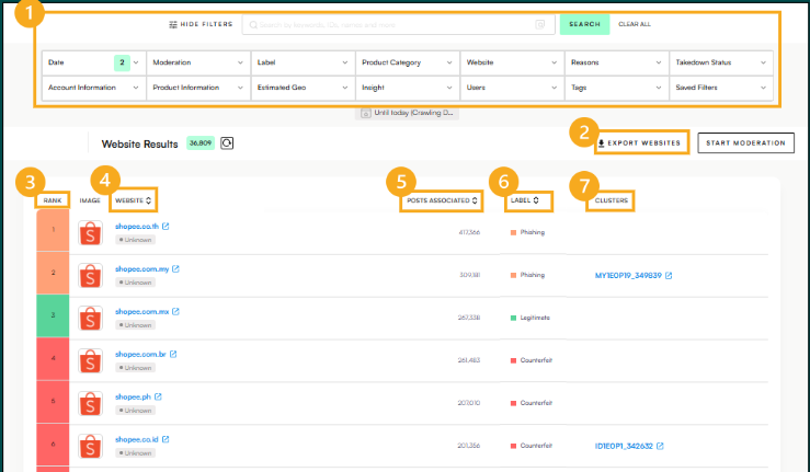In Website View, websites are ranked by the number of potentially infringing posts per website/domain, with the highest listed first. The Website View displays the following important features and information:
