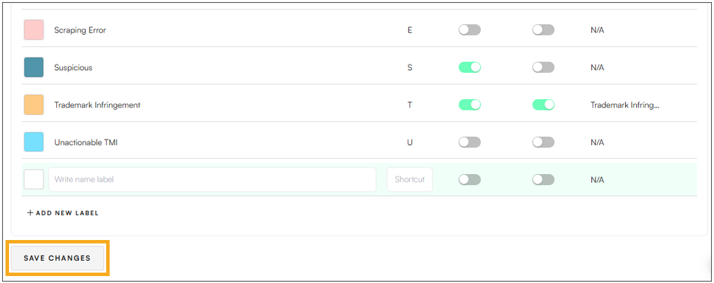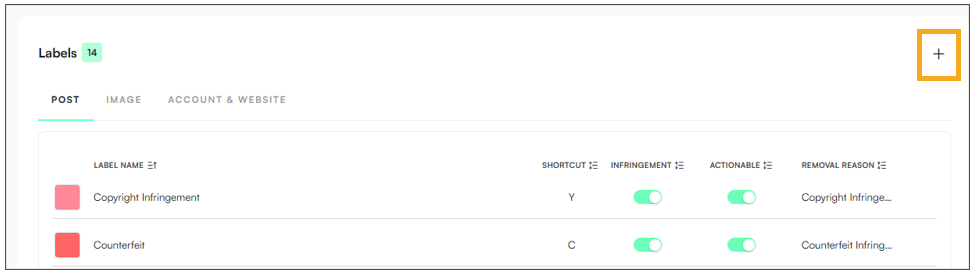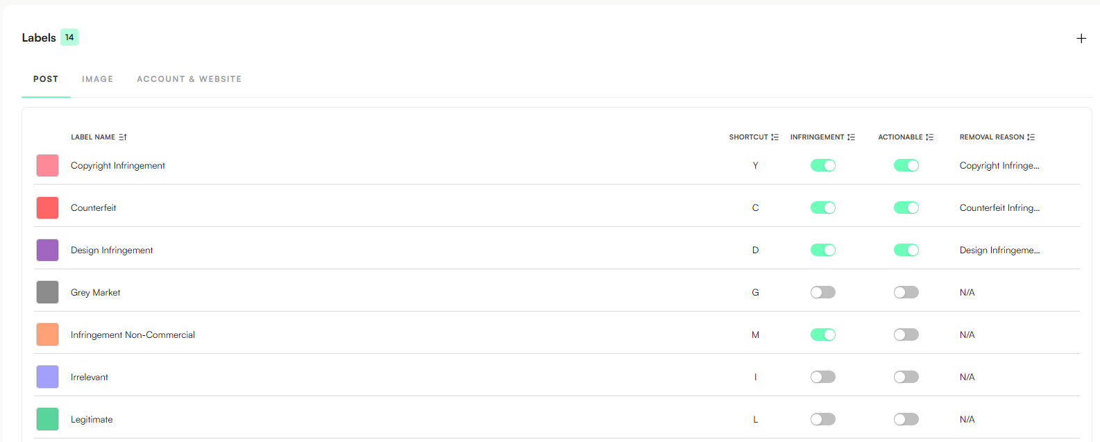 Client Migration: Existing Labels from Talisman & Zero are already added and available in the Settings page (such as Counterfeit, Trademark Abuse and Legitimate, for example).
