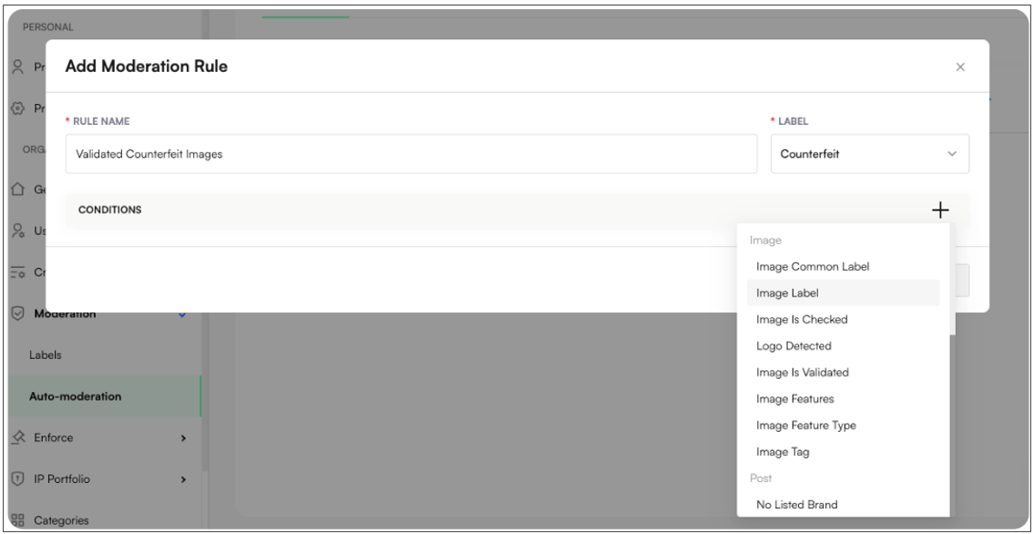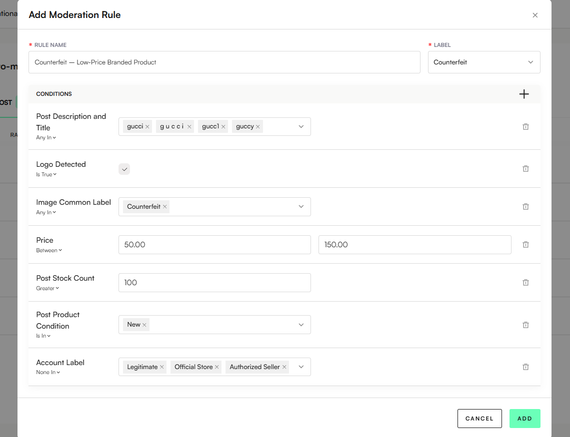 Label: The classification to apply when the rule is triggered (e.g., Counterfeit, Legitimate).