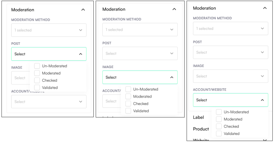 Moderation filters allow users to refine results based on an itemโs stage, such as unmoderated, moderated, checked, or validated.