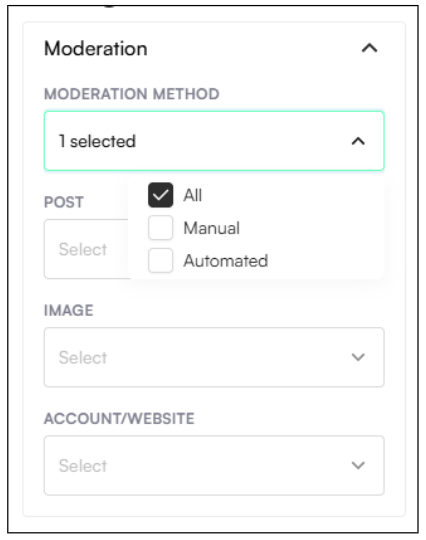 Automatic | Items moderated automatically by system rules or AI-based detection. |