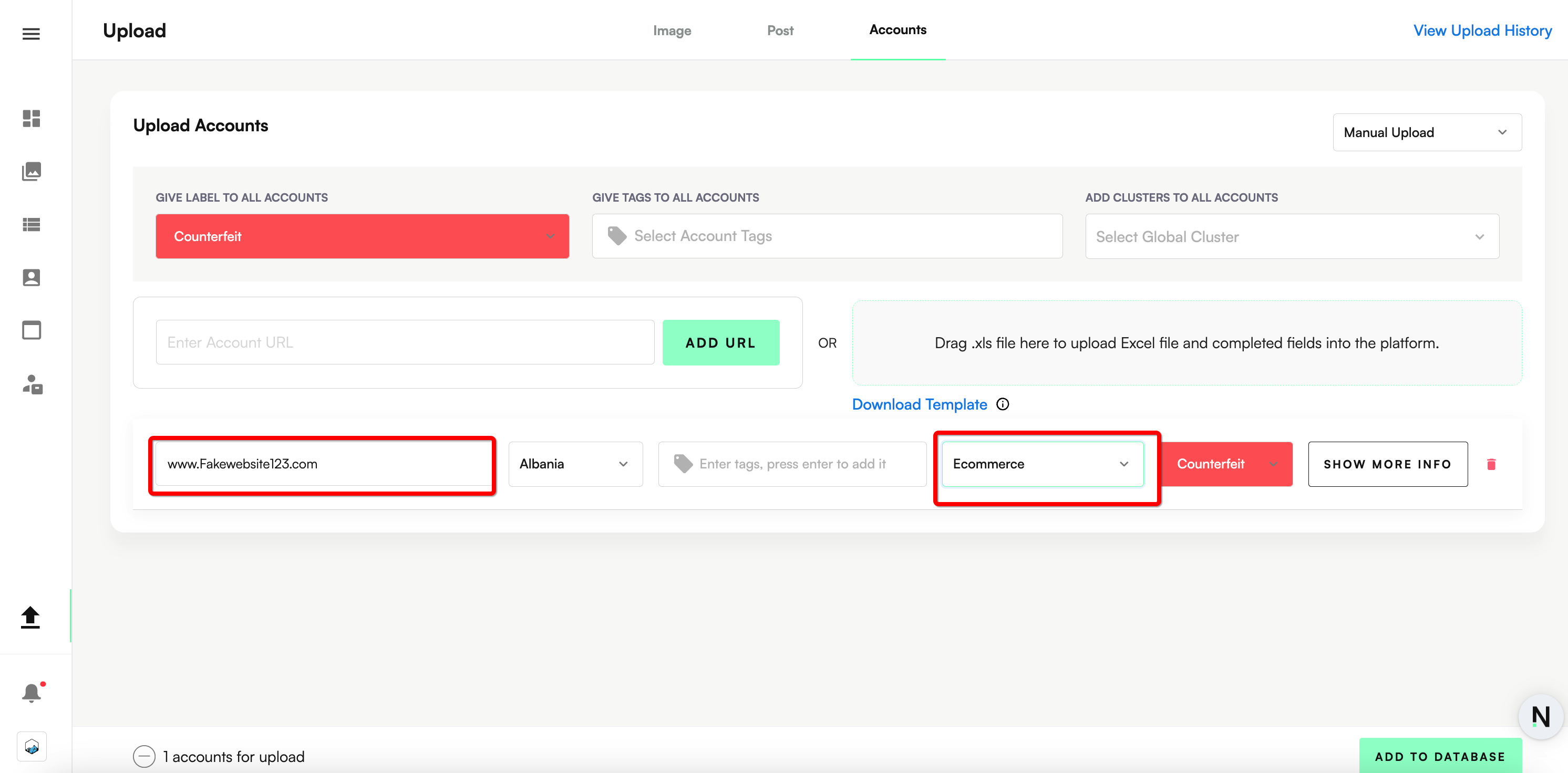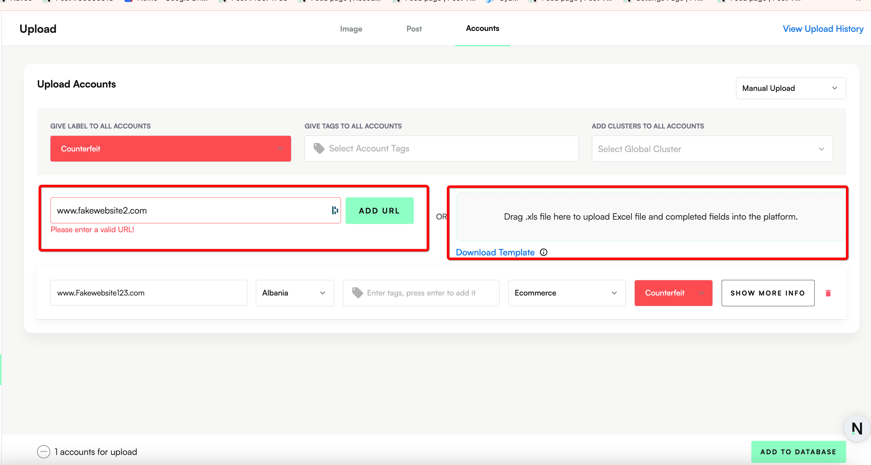 Enter each individual website URL or otherwise utilize the Excel option for bulk upload.