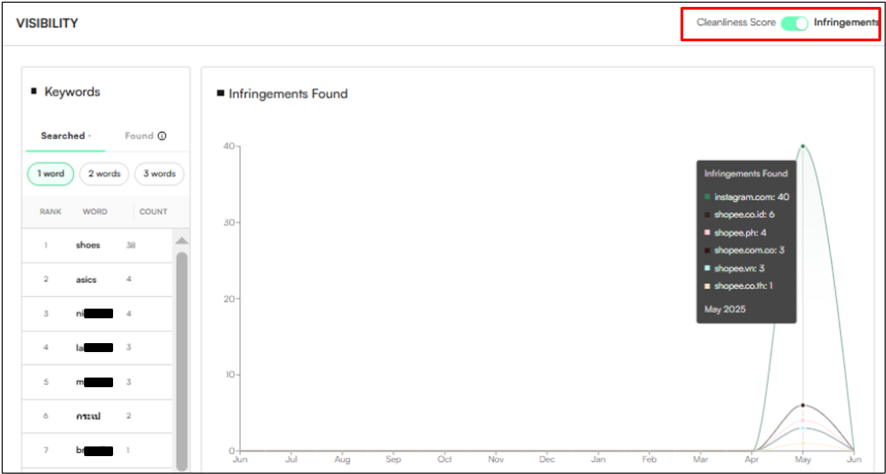 Users can assess how free specific platforms or domains are from infringements, using keyword-based metrics: