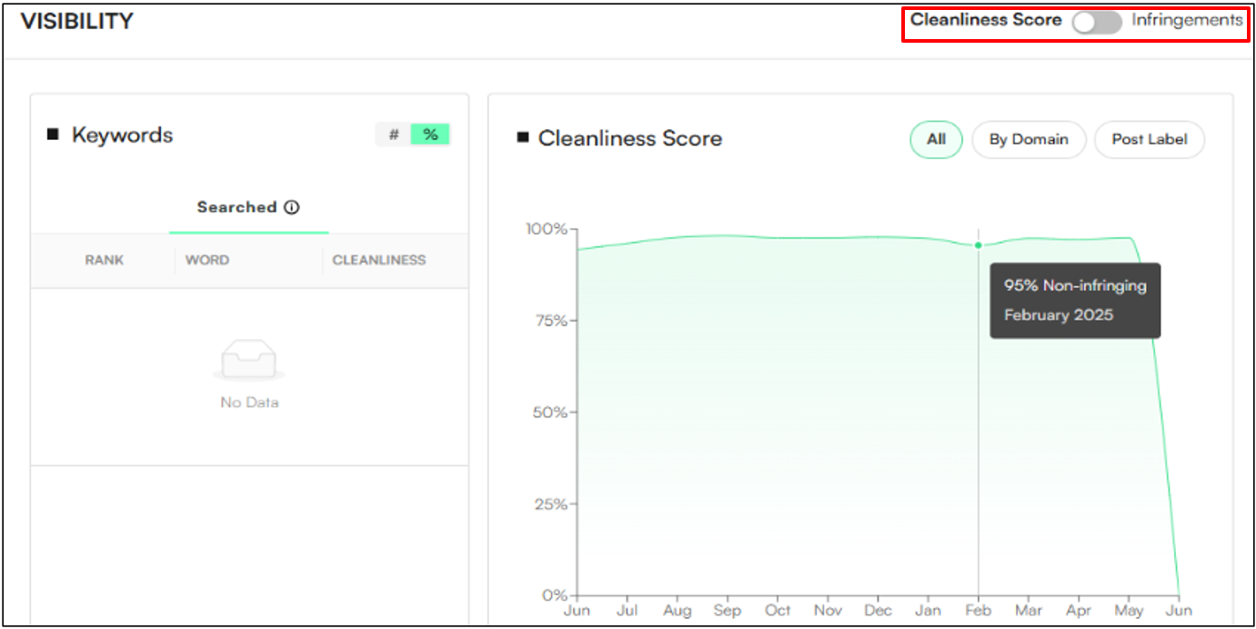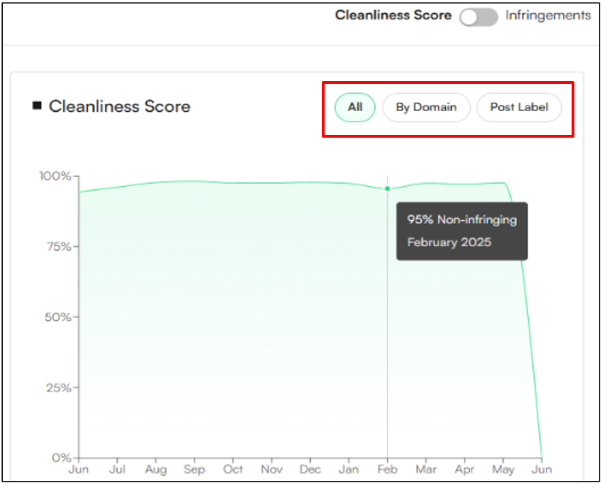 shows how many posts about your brand are “clean” (legitimate) versus “dirty” (infringing or suspicious). It’s a simple percentage: